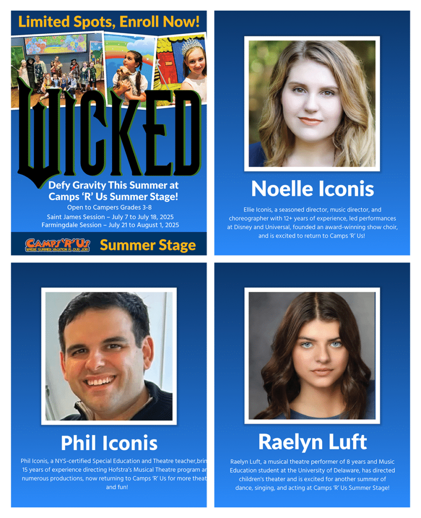 🌟 Defy Gravity This Summer at Camps ‘R’ Us Summer Stage!🎭 Join us for a wickedly fun summer of singing, dancing, and acting, guided by experienced directors. Campers learn, grow, and shine while building confidence, friendships, and show-stopping skills!