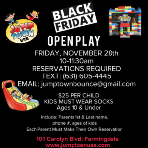 Black Friday Open Play Black Friday open play text for reservations: 631-605-4445 Event details:Start dateNovember 28, 2025 10:00 amStart time10:00 amEnd time11:30 amLocationJump Town USALocation Address101 Carolyn Blvd., FarmingdaleWebsitewww.jumptownusa.comGoogle Calendar iCal feed URL https://yourlocalkids.com/?rhc_action=get_icalendar_events&ID=34089 Get Feed for iCal (Google Calendar). This is for subscribing to the events in the Calendar. Add this URL to either iCal (Mac) or Google Calendar, or any other calendar that supports iCal Feed. Download ICS file Venue DetailsVenueJump Town USAAddress101 Carolyn Blvd., FarmingdaleCityFarmingdalePostal code11735StateNYCountryUnited StatesInformationPhone631-414-7872Websitewww.jumptownusa.comGet directionsGet directions |||:: 101 Carolyn Blvd., Farmingdale, NY, 11735
