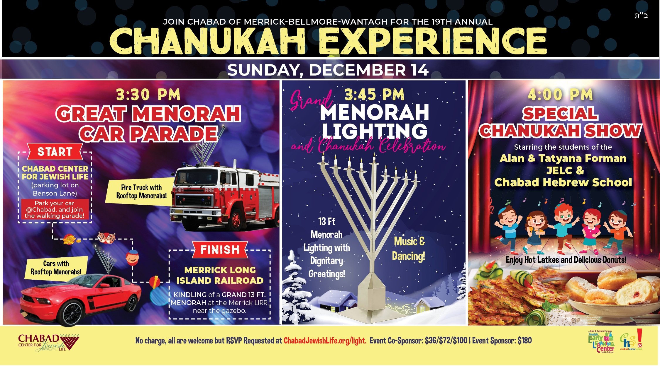 Chanukah Experience Location: Chabad Center for Jewish Life , 2174 Hewlett Ave, Merrick For more info click here Event details:Start dateDecember 14, 2025 3:30 pmStart time3:30 pmEnd time4:00 pmLocationGoogle Calendar iCal feed URL https://yourlocalkids.com/?rhc_action=get_icalendar_events&ID=45488 Get Feed for iCal (Google Calendar). This is for subscribing to the events in the Calendar. Add this URL to either iCal (Mac) or Google Calendar, or any other calendar that supports iCal Feed. Download ICS file Venue DetailsVenueInformation