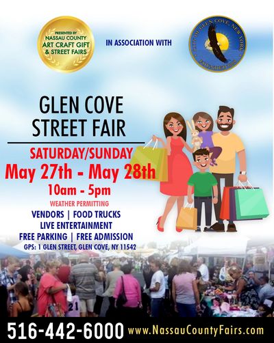 Glen Cove Street Fair Free admission and parking For more information click here Event details:Start dateMay 27, 2023 10:00 amStart time10:00 amEnd time5:00 pmLocationGoogle Calendar iCal feed URL https://yourlocalkids.com/?rhc_action=get_icalendar_events&ID=32591 Get Feed for iCal (Google Calendar). This is for subscribing to the events in the Calendar. Add this URL to either iCal (Mac) or Google Calendar, or any other calendar that supports iCal Feed. Download ICS file Venue DetailsVenueInformation