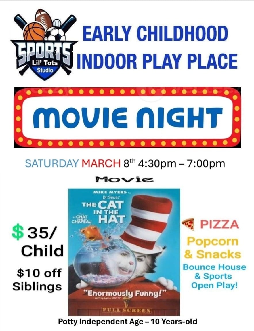 Movie Night – The Cat in The Hat For more info and tickets go to Lil’ Tots Sports Studio Event details:Start dateMarch 8, 2025 4:30 pmStart time4:30 pmEnd time7:00 pmLocationLil Tots Sports StudioLocation Address10 Farber Dr. Suite 3, BellportWebsitewww.liltotssportsstudio.comGoogle Calendar iCal feed URL https://yourlocalkids.com/?rhc_action=get_icalendar_events&ID=41743 Get Feed for iCal (Google Calendar). This is for subscribing to the events in the Calendar. Add this URL to either iCal (Mac) or Google Calendar, or any other calendar that supports iCal Feed. Download ICS file Venue DetailsVenueLil Tots Sports StudioAddress10 Farber Dr. Suite 3, BellportCityBellportPostal code11713StateNYCountryUnited StatesInformationPhone631-807-7335Websitewww.liltotssportsstudio.comGet directionsGet directions |||:: 10 Farber Dr., Bellport, New York, 11713