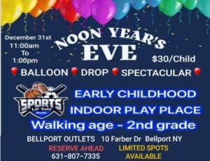 Noon Year’s Eve Celebration Toddlerrific NOON YEARS EVE Celebration! Food, Bounce Houses & Balloons. For walking Age – 2nd Grade. Event details:Start dateDecember 31, 2024 11:00 amStart time11:00 amEnd time1:00 pmLocationLil Tots Sports StudioLocation Address10 Farber Dr. Suite 3, BellportWebsitewww.liltotssportsstudio.comGoogle Calendar iCal feed URL https://yourlocalkids.com/?rhc_action=get_icalendar_events&ID=39810 Get Feed for iCal (Google Calendar). This is for subscribing to the events in the Calendar. Add this URL to either iCal (Mac) or Google Calendar, or any other calendar that supports iCal Feed. Download ICS file Venue DetailsVenueLil Tots Sports StudioAddress10 Farber Dr. Suite 3, BellportCityBellportPostal code11713StateNYCountryUnited StatesInformationPhone631-807-7335Websitewww.liltotssportsstudio.comGet directionsGet directions |||:: 10 Farber Dr., Bellport, New York, 11713