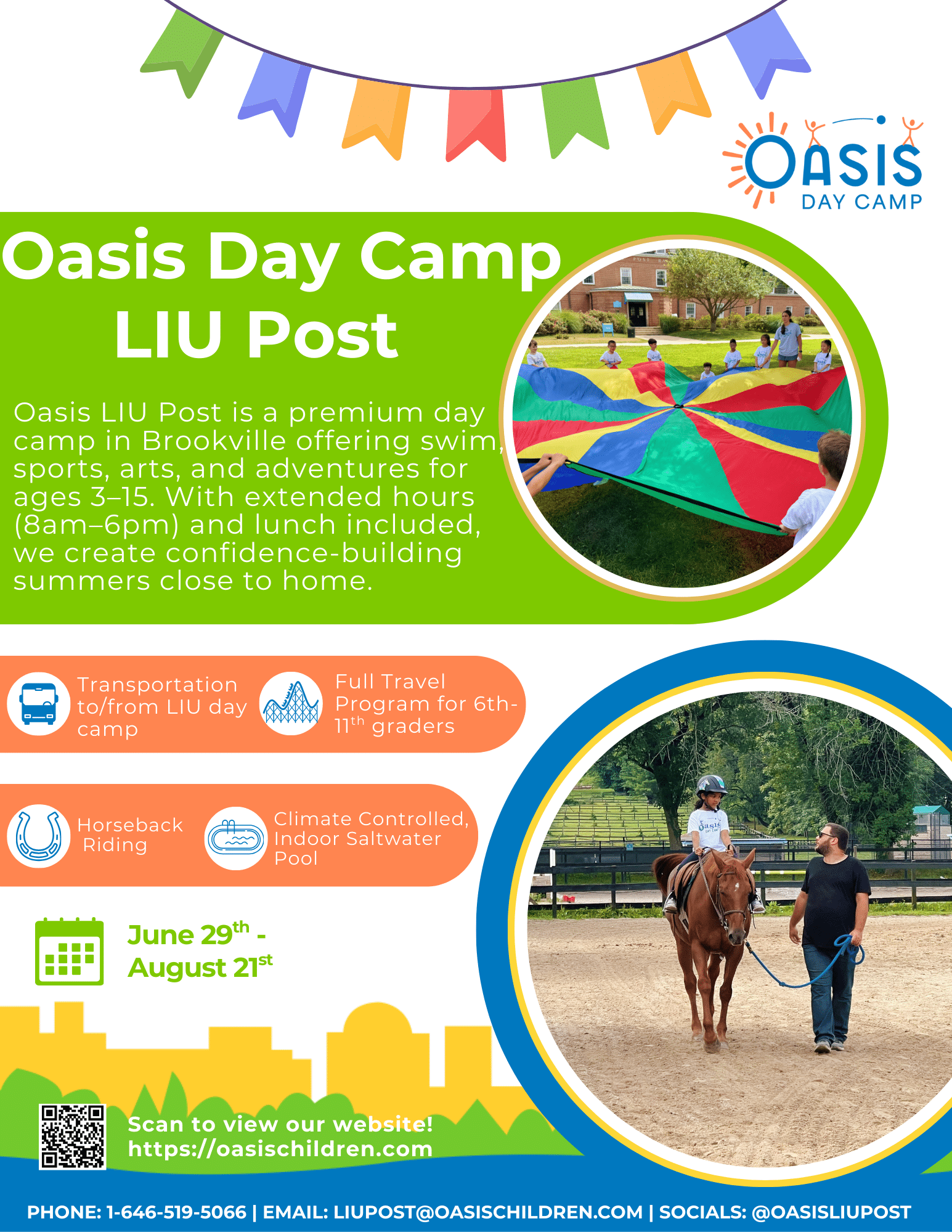 Oasis Day Camp, located on the campus of LIU Post University in Brookville Long Island, caters to campers 3 – 16 years old. A traditional day camp in every way, Oasis at LIU Post has quality age-appropriate programming at parent-friendly prices. Oasis has daily swim instruction, incredible grounds, air-conditioned indoor facilities, loads of activities, teen trips and, the most well trained, caring staff in the industry. Daily hot lunch and snacks are included. Optional horseback riding program is offered for 1st-5th graders. Oasis gives campers the opportunity to be active, think creatively, and discover new friendships that will last a lifetime.