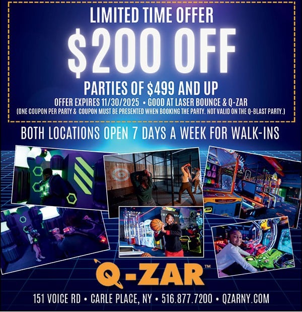 Open Play Open 7 Days a Week. For more info and reservations do to www.qzarny.com Laser Bounce & QZar Event details:Start dateOctober 30, 2025Start timeEnd timeLocationQ-ZARLocation Address151 Voice Rd, Carl PlaceWebsitewww.qzarny.comGoogle Calendar iCal feed URL https://yourlocalkids.com/?rhc_action=get_icalendar_events&ID=42060 Get Feed for iCal (Google Calendar). This is for subscribing to the events in the Calendar. Add this URL to either iCal (Mac) or Google Calendar, or any other calendar that supports iCal Feed. Download ICS file Venue DetailsVenueQ-ZARAddress151 Voice Rd, Carl PlaceCityCarl PlacePostal code11514StateNew YorkInformationPhone516-877-7200Websitewww.qzarny.com