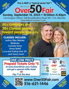 Join the 16th annual Over 50 Fair, a celebration of life on Long Island for adults age 50+. Part health and wellness fair, part conference, and part activities and lifestyle expo with over 80 exhibitors on hand, with information about travel, health/wellness products and services, saving for retirement, home improvement, non-profits, and much more.