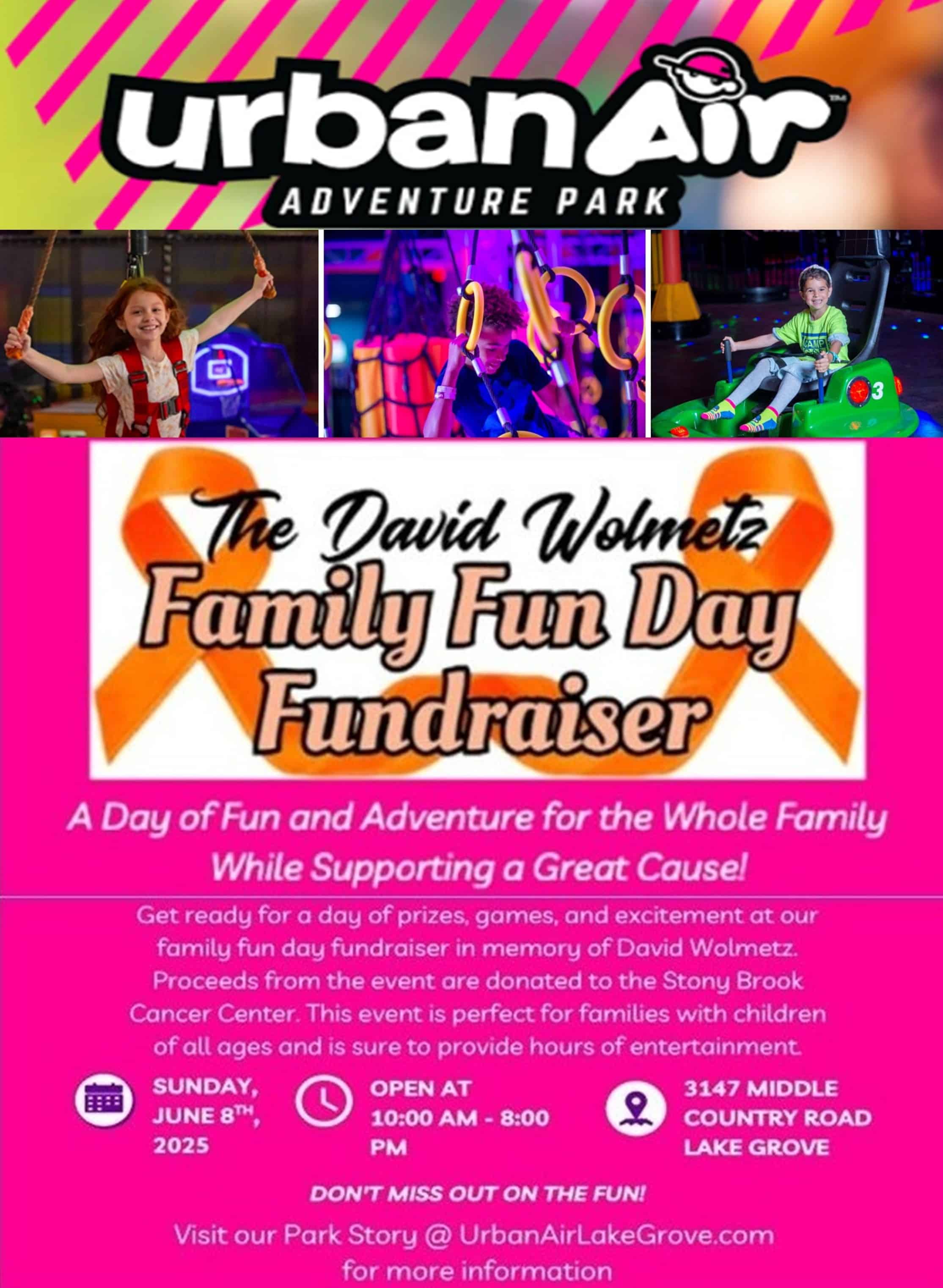 The Dave Wolmetz Family Fun Day Fundraiser For tickets go to Urban Air Lake Grove Event details:Start dateJune 8, 2025 10:00 amStart time10:00 amEnd time8:00 pmLocationUrban Air Lake GroveLocation Address3147 Middle Country Road, Lake GroveWebsitewww.urbanair.comGoogle Calendar iCal feed URL https://yourlocalkids.com/?rhc_action=get_icalendar_events&ID=43130 Get Feed for iCal (Google Calendar). This is for subscribing to the events in the Calendar. Add this URL to either iCal (Mac) or Google Calendar, or any other calendar that supports iCal Feed. Download ICS file Venue DetailsVenueUrban Air Lake GroveAddress3147 Middle Country Road, Lake GroveCityLake GrovePostal code11755StateNYInformationPhone631-861-4125Websitewww.urbanair.comGet directionsGet directions |||:: 3147 Middle Country Road, Lake Grove, NY 11755