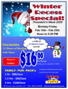 Winter Recess Special Bowl Hours February 16th – 20th lanes open at 12 noon. Event details:Start dateFebruary 20, 2026 12:00 pmStart time12:00 pmEnd time5:00 pmLocationLevittown LanesLocation Address56 Tanners Lane, LevittownWebsitewww.levittownbowling.comGoogle Calendar iCal feed URL https://yourlocalkids.com/?rhc_action=get_icalendar_events&ID=41518 Get Feed for iCal (Google Calendar). This is for subscribing to the events in the Calendar. Add this URL to either iCal (Mac) or Google Calendar, or any other calendar that supports iCal Feed. Download ICS file Venue DetailsVenueLevittown LanesAddress56 Tanners Lane, LevittownCityLevittownPostal code11756StateNYInformationPhone516.731.5700Websitewww.levittownbowling.comGet directionsGet directions |||:: 56 Tanners Lane, Levittown, NY 11756