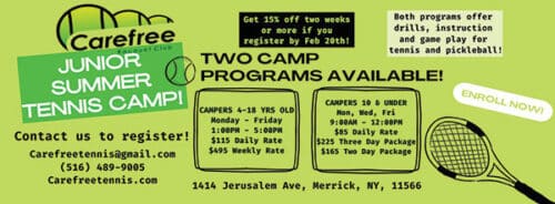 Long Island Directory Carefree Racquet Club Summer Camp Website: www.carefreetennis.com Phone Number: 516-489-9005 Address: 1414 Jerusalem Ave, Merrick ZIP Code: 11566 Directions to listing From: Current location Specific Address Travel Mode: Driving Public Transit Walking Cycling Send Message to listing owner Listing Title: Carefree Racquet Club Summer Camp Your Name Your Email Message