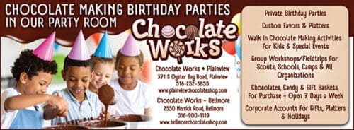 Long Island Directory Chocolate Works Bellmore Website: www.bellmorechocolateshop.com Phone Number: 516-900-1119 Address: 2350 Merrick Rd., Bellmore, NY ZIP Code: 11710 Directions to listing From: Current location Specific Address Travel Mode: Driving Public Transit Walking Cycling Send Message to listing owner Listing Title: Chocolate Works Bellmore Your Name Your Email Message