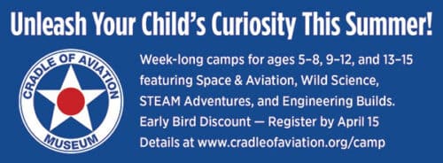 Long Island Directory Cradle of Aviation Museum Summer Camp Website: www.cradleofaviation.org Phone Number: 516-572-4111 Address: Charles Lindbergh Blvd, Garden City ZIP Code: 11530 Directions to listing From: Current location Specific Address Travel Mode: Driving Public Transit Walking Cycling Send Message to listing owner Listing Title: Cradle of Aviation Museum Summer Camp Your Name Your Email Message