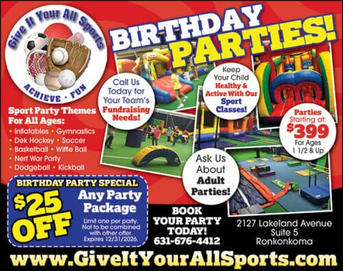 Long Island Directory Give It Your All Sports Description: Sports classes, camps and birthday parties at our convenient Rokonkoma location. Website: www.giveityourallsports.com Phone Number: (631) 676-4412 Address: 2127 Lakeland Ave Suite 5, Ronkonkoma, NY ZIP Code: 11779 Directions to listing From: Current location Specific Address Travel Mode: Driving Public Transit Walking Cycling Send Message to listing owner Listing Title: Give It Your All Sports Your Name Your Email Message