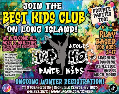 Long Island Directory J. Coles Hip Hop Dance Kids Website: https://mysite.vagaro.com/jch85y/home Phone Number: 646-753-2573 Address: 111 N Oceanside Rd, Rockville Center, NY ZIP Code: 11570 Directions to listing From: Current location Specific Address Travel Mode: Driving Public Transit Walking Cycling Send Message to listing owner Listing Title: J. Coles Hip Hop Dance Kids Your Name Your Email Message