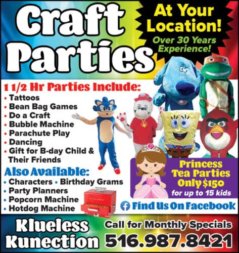 Long Island Directory KLUELESS KUNECTION Description: Craft Parties, Princess Tea Parties, Characters, Birthday Grams, Party Planners & More! Phone Number: (516) 987-8421 Send Message to listing owner Listing Title: KLUELESS KUNECTION Your Name Your Email Message