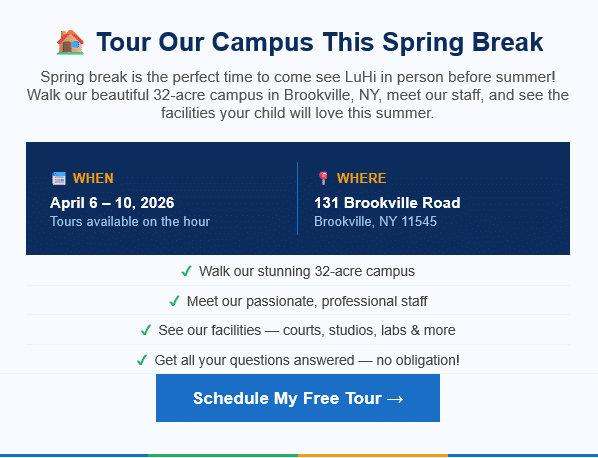 Whether your child is a budding athlete, future artist, tech innovator, or natural-born leader — LuHi’s expert, passionate staff will meet them exactly where they are. Programs are open to campers from Pre-K through 12th Grade, with flexible 2-week sessions designed to fit your family’s schedule.